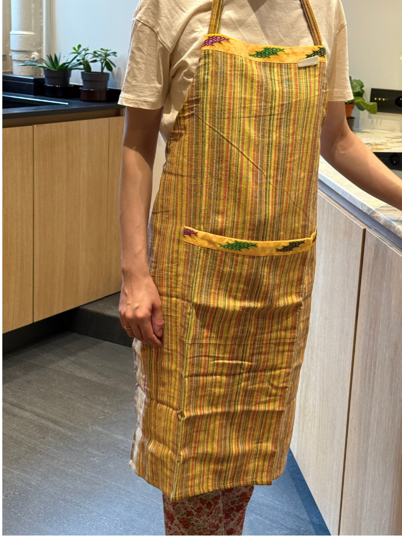 Diese in Myanmar handgefertigte Schürze verkörpert die perfekte Mischung aus Funktionalität, Ästhetik und Tradition. Ihre dichte, gleichmäßige Webart zeugt von der Sorgfalt, mit der die Weber jedes einzelne Stück herstellen – wahre Hüter eines von Generation zu Generation weitergegebenen Handwerks.